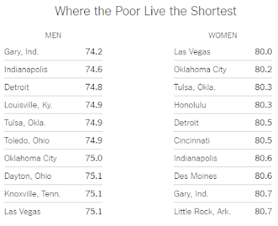The latest wrinkle is a detailed study of longevity in the 100 largest metropolitan areas. Geography does not seem to have much impact on how long the rich live, but there are big differences for the poor. Southern California seems like a good place to be poor, which made me think of the weather, but on the other hand Honolulu seems to be a bad one. Except for Las Vegas and Honolulu, the cities that show up on the short lives list have a lot in common: fading industrial towns where a lot of people are marking time. I'm going to stereotype Las Vegas by saying that lives there are shortened by alcohol, drugs, and foolishness. Which leads me to think that for the other places the biggest difference is hope. To look around and think that the best days of everything you see are past, to worry that everything is trending downward, to watch the best young people leave and the worst sink into the mire, seems to take five years off your life.