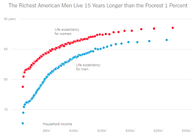 It's not really news that in the U.S. rich people live longer than poor people. The richest 1% of men live 15 years longer than the poorest 1%; for women the difference is ten years. There are some questions about causality here, since bad health is one reason some people are poor, but even if you try to account for stuff like that the rich still live years longer.