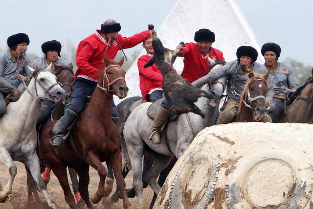 Very helpful to know that Kok-boru is similar to Byzkashi; that explains so much. I take it this is the sport in question. According to The Guardian, this is "the biggest draw and most fiercely contested sport." Looks like a blast.