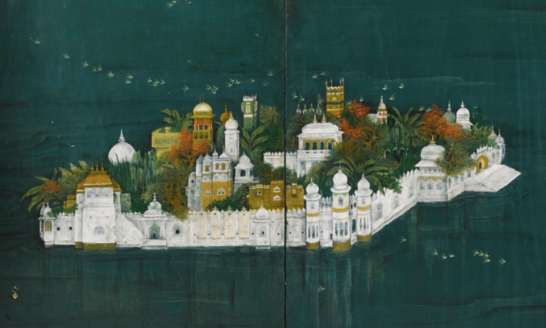 Details from a large painted three-panel screen depicting the City Palace at Udaipur and Lake Pichola, India, 19th century