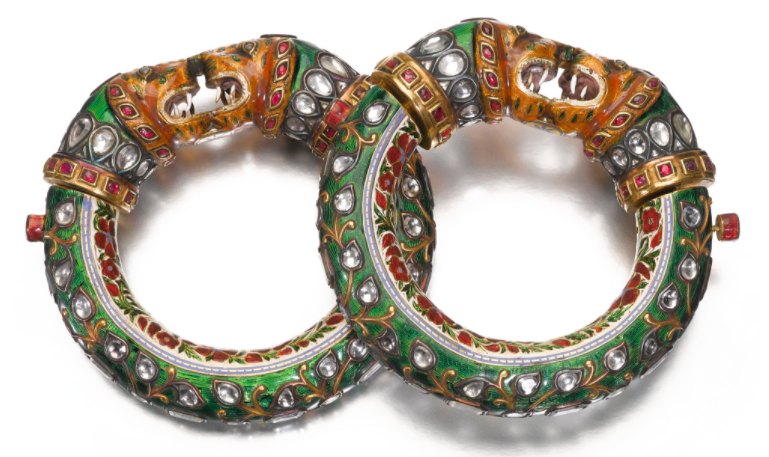 A large pair of enamelled bracelets with tiger heads, North India, 19th century