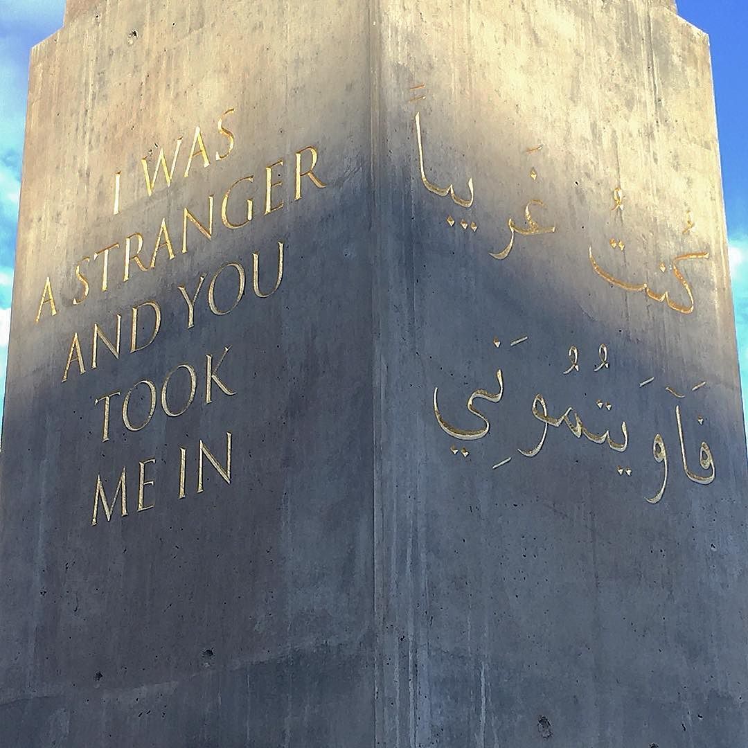 I Was a Stranger and You Took Me In, otherwise Monument to Strangers and Refugees, by Nigerian-American artist Olu Oguibe. Currently in Kassel, Germany. Text is from the Parable of the Sheep and the Goats. Jesus is speaking: