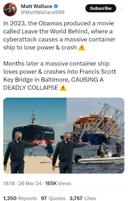 Apparently Barack and Michele Obama once made a documentary that included a scene of a huge ship running onto a beach, which somehow proves they were behind this attack.