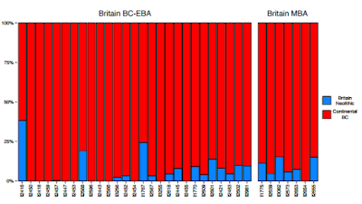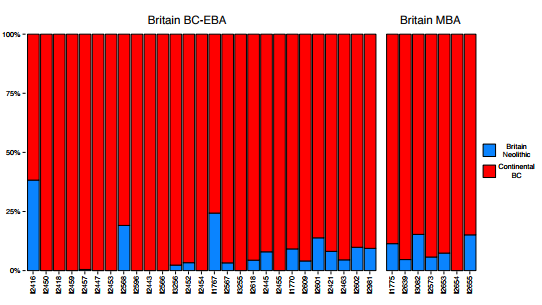 This is only 80 skeletons, and in this period the surviving burials probably skew toward people of high status. But the evidence is stark: Britain's Neolithic inhabitants left few Bronze Age descendants. In the graph above, the oldest individuals are on the left, and later ones on the right; you can see that by the Middle Bronze, after 2000 BCE, the population seems to have settled down around 80% invader.