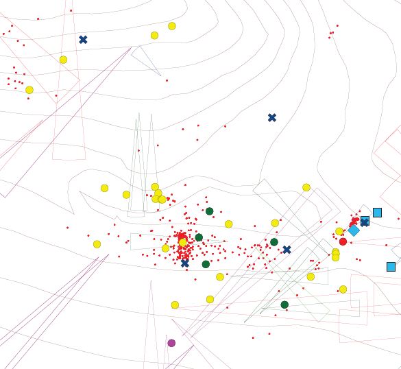 The area just west of the map above. Here there are fewer ballista bolts but many more hobnails, perhaps suggesting hand-to-hand combat.