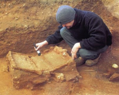 The first exciting artifacts found at Prittlewell were bronze bowls that had been hanging from the wall. One (above) was imported from the Mediterranean; another was of Celtic manufacture (seven pictures down).