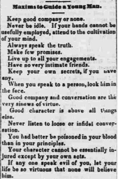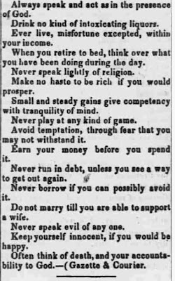 Some version of this list appeared in dozens of American newspapers in the 1850s, in all parts of the country. I notice in particular the injunction to have "no very intimate friends." When young men put their minds together, bad things result. . . .