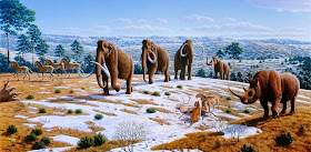 Anyway the "natural" ecosystems of the past 10,000 years are not really natural at all. They have been stripped of many large species, and, although the data is not as good, probably many small ones as well. This loss changed the planet in many ways, although it is hard to be sure which changes were due to the end of the Ice Age and which to the loss of species. Most paleoecologists believe, though, that the loss of large herbivores in particular greatly altered the world. For example in the Ice Age vast stretches of Siberia and the drowned land of Beringia were what we call Mammoth Steppe, grasslands roamed by mammoths, woolly rhinocerous, and other species of giant herbivores. The loss of those grazing species, some believe, led those areas to grow up in forest.